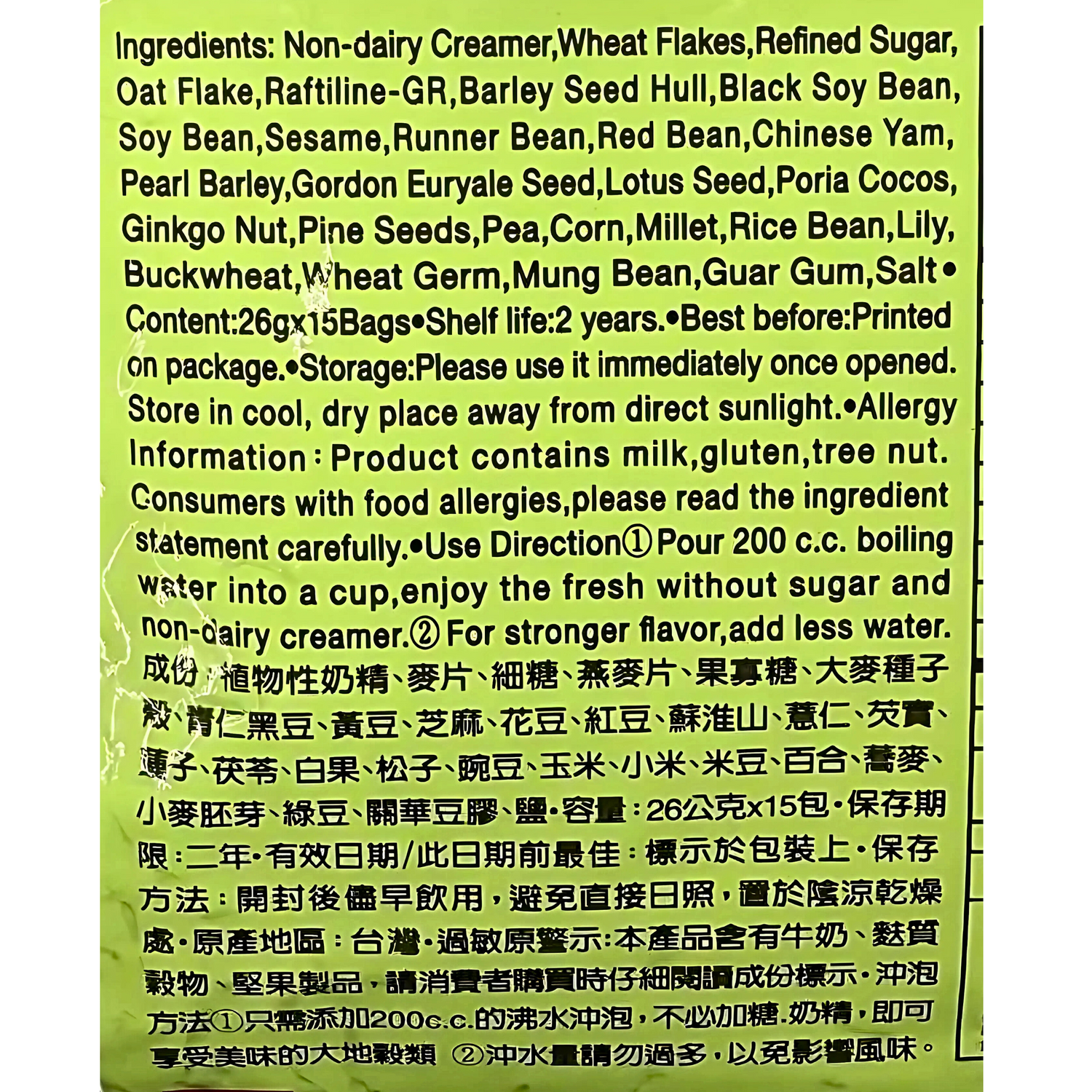 Grain Master is nourished by several grain, wheat, bean extracts and Chinese prescription materials. It is blended with US-imported natural grain flour, brown rice enzymes, and natural FOS. Our ingredients are completely natural without preservatives and chemical addictives. In order to maintain high fiber, calcium, and a variety of nutrients, the making process is by professional sauté instead of high pressure and high temperature fry. After grinding, it is roasted and sterilized by special machines and lower its moisture and oil.