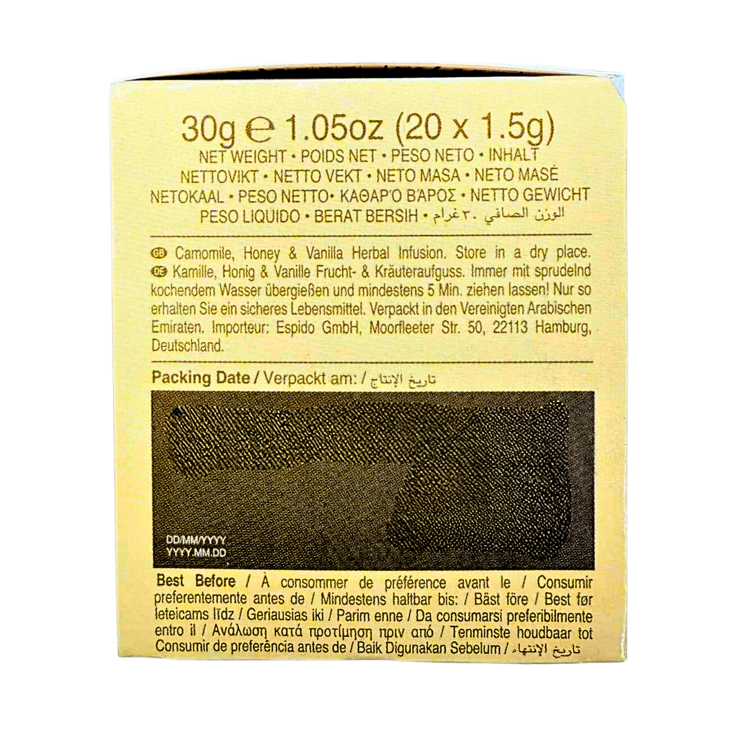 Camomile, Honey, & Vanilla Infusion includes delicious sweet notes. Golden honey and natural vanilla add a soothing sweetness to camomile’s soft dried grass notes in this award-winning infusion. Our Tea Masters use the finest ingredients to create a harmonious herbal tea blend. Quality camomile leaves are joined by vanilla and dried honey pieces that melt into every infusion.