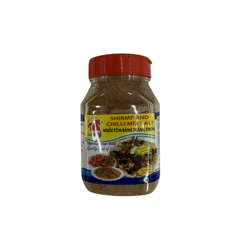 Best Taste Shrimp & Chili Salt is a flavorful blend of coarse salt, dried shrimp, and vibrant red chili, offering a bold, savory-spicy taste with a naturally sweet shrimp undertone. The chili adds a pleasant heat while the salt provides a satisfying crunch. Perfect for dipping fresh fruits, veggies, boiled eggs, or sprinkling over rice, noodles, mixed rice paper, and various snacks. Comes in a convenient 200g jar for easy use and storage.