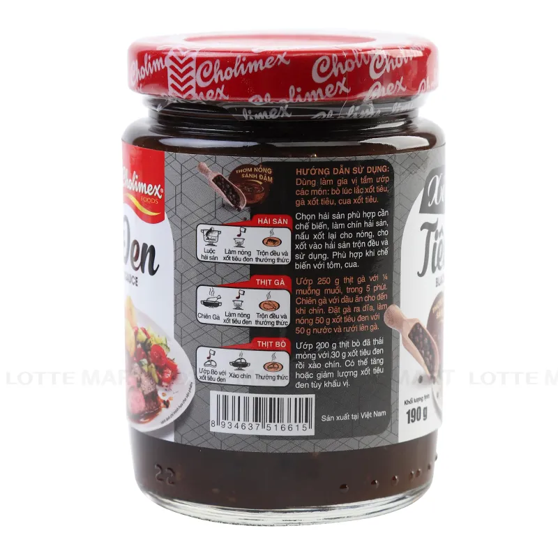 Cholimex Black Pepper Sauce (190g) is made from carefully selected black peppercorns, offering a bold aroma, spicy flavor, and a pleasant warming sensation that stimulates the taste buds. The sauce has a slightly thick texture with a rich balance of savory and mildly sweet notes, complemented by a subtle creaminess.
