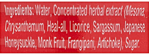 Water, sugar, lonicera japonica thunb 3.4%, chrysanthemum 3.2%, momordica grosvenori 2.1%, prunella vulgaris 1.8%, glycyrrhiza uralensis 1.6%, plumeria rubra 1.5%, gossampinus malabarica 0.7%, microcos panicutula 0.5%, mesona chinensis benth 0.5%.