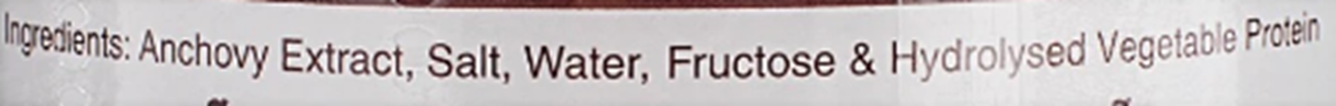 Ingredients: Anchovy extract, salt, water, fructose and hydrolysed vegetable protein.