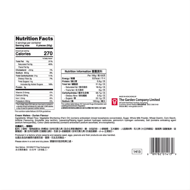 [Garden] Durian Cream Wafers - 7oz deliver a delightful combination of light, crispy wafer layers and smooth, aromatic durian cream. Each bite offers a balanced blend of sweetness and the signature richness of tropical durian, creating a snack that is both bold and satisfying.