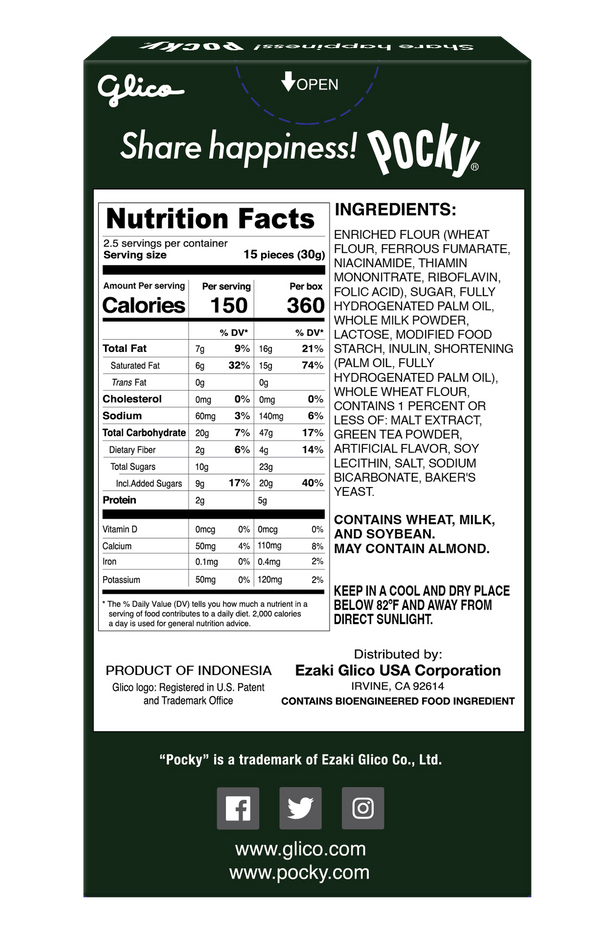 **Glico Pocky Matcha** is a sophisticated take on the classic Pocky snack, featuring crunchy biscuit sticks coated in a smooth layer of matcha-flavored cream. Made with real Japanese matcha green tea, this coating offers an authentic, slightly earthy flavor with a hint of sweetness, perfectly balancing the crispiness of the biscuit stick. This treat is ideal for matcha enthusiasts or anyone looking for a unique, refreshing snack. **Glico Pocky Matcha** is a delightful choice for a moment of indulgence, offering a taste of Japanese tradition in every bite.