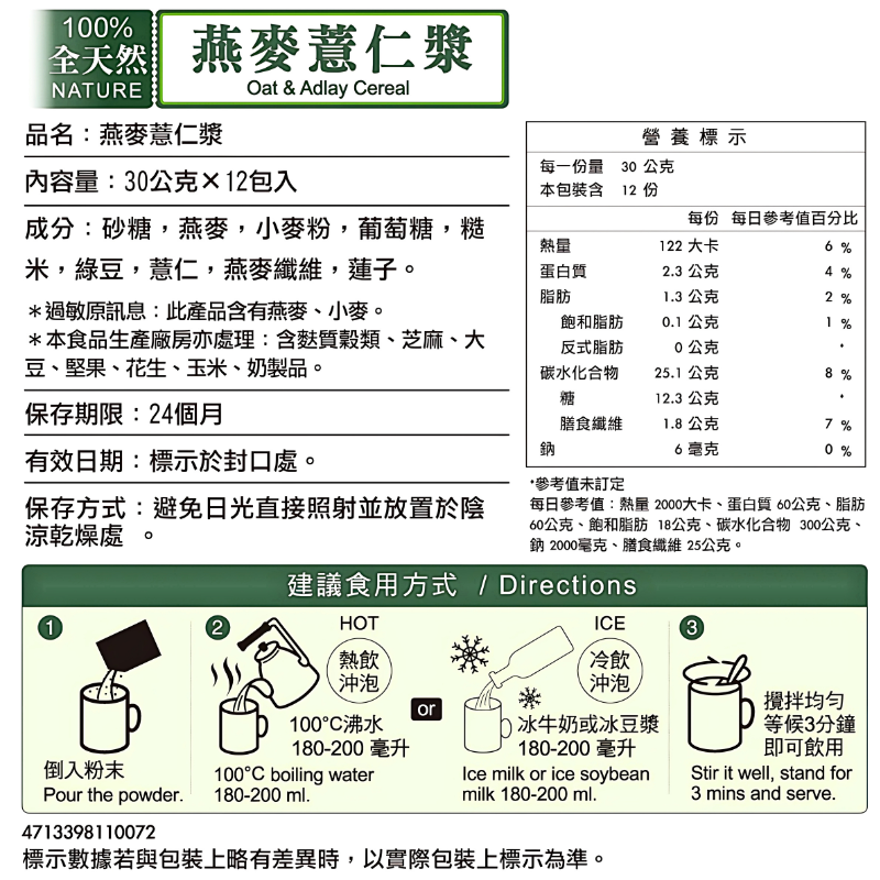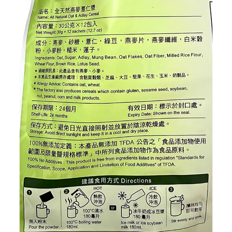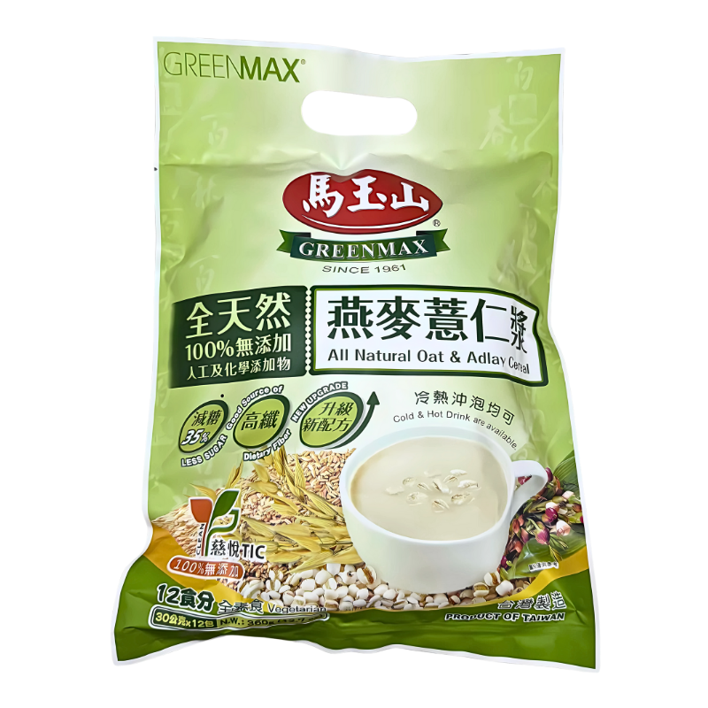 Greenmax Oat & Adlay Cereal combines wholesome oats with nutrient-rich adlay (Job’s tears) to create a smooth, aromatic, and satisfying drink. Naturally hearty and delicious, it’s perfect for breakfast or a quick, nourishing snack. Just add hot water for a warm, comforting cup that’s both tasty and good for your well-being.
