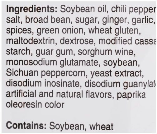 Ingredients: Soybean Oil, Salt, Chili Pepper, Broad Bean Sauce (Chili Pepper, Broad Bean, Water, Salt, Wheat Flour), Prickly Ash Bark, Spirit (Water, Sorghum, Rice, Wheat, Corn), Sugar, Green Onion, Pickled Ginger [Ginger, Water, Salt, Citric Acid, Acetic Acid, Erythorbic Acid (Preservative), Sodium Metabisulfite (Preservative)], Ginger, Garlic, Fermented Soybean Paste (Yeast, Water, Monosodium Glutamate, Salt, Sodium Citrate), Disodium Inosinate, Disodium Guanylate, Fennel, Cassia, Star Anise, Orange Peel, Licorice, Prickly Ash Bark Oleoresin, Ethyl Maltol.