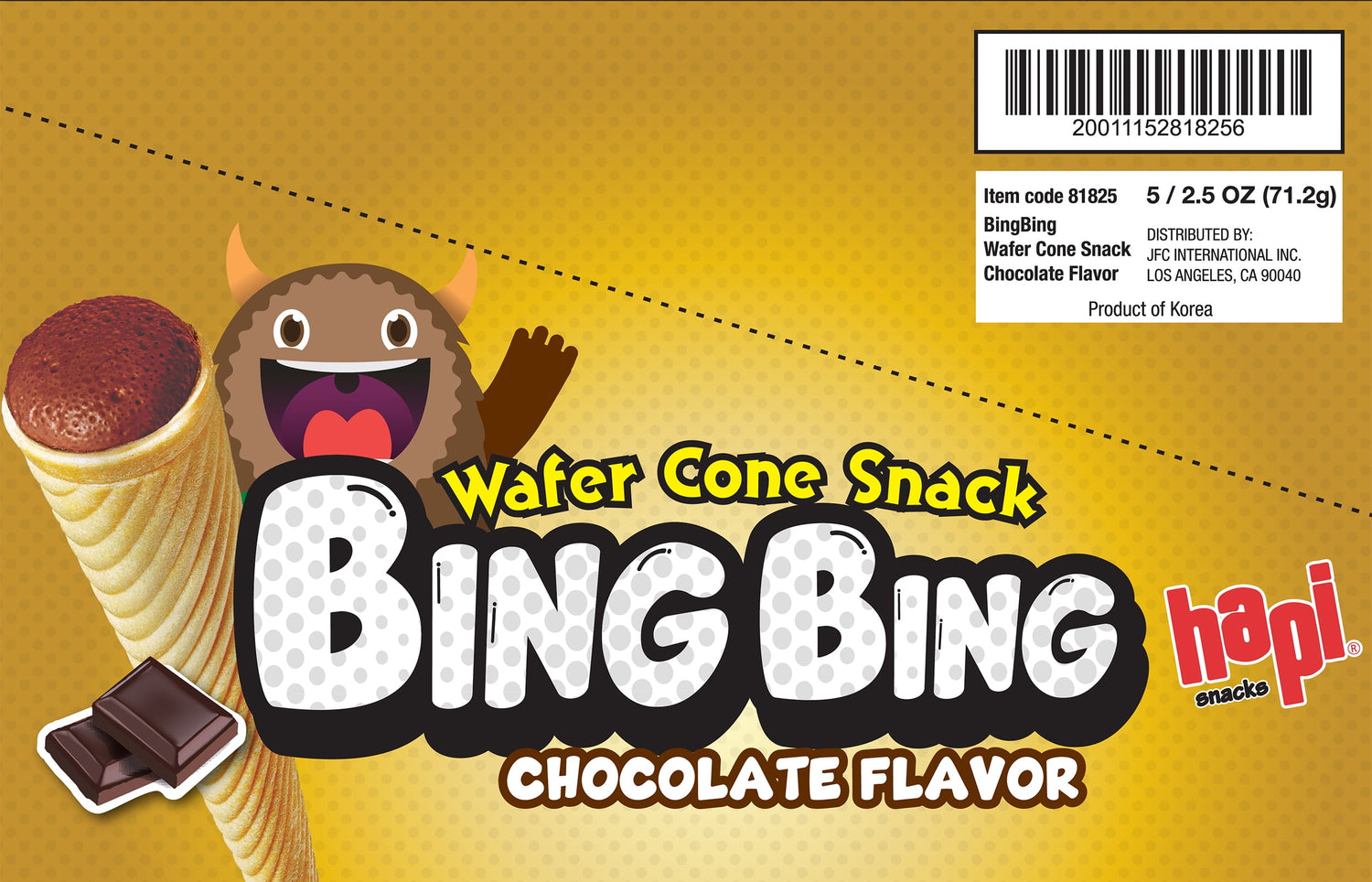 Hapi Snacks Wafer Cone Chocolate Flavored is a deliciously crunchy, cone-shaped snack filled with rich chocolate. Each cone offers a crispy outer shell made from a blend of high-quality ingredients, delivering a satisfying texture that’s light and airy. The creamy chocolate filling adds a sweet contrast to the crunchy cone, making it a delightful treat for chocolate lovers.