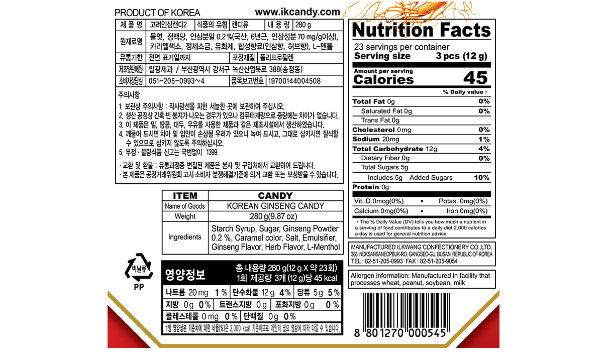 Ilkwang Korean Ginseng Candy is a traditional Korean treat made with authentic ginseng extract, known for its health benefits and energizing properties. Each candy has a distinctive, slightly bitter flavor profile characteristic of ginseng, balanced with a mild sweetness. It’s popular for its unique taste and potential health benefits, such as boosting energy levels and supporting immune health. Individually wrapped for convenience, these candies are ideal for on-the-go consumption or as a unique, herbal-inspired treat.