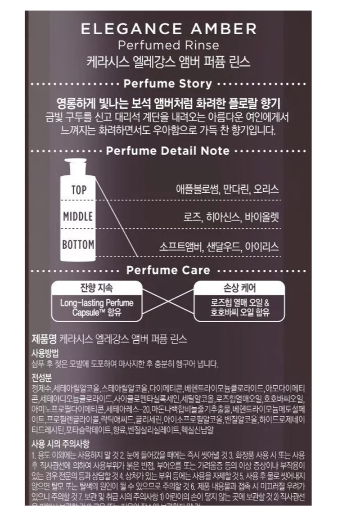 How to Use: Apply to damp hair after shampooing, focusing on mid-lengths and ends. Leave for a few minutes, then rinse thoroughly. For best results, use with Kerasys Elegance Amber Shampoo.
