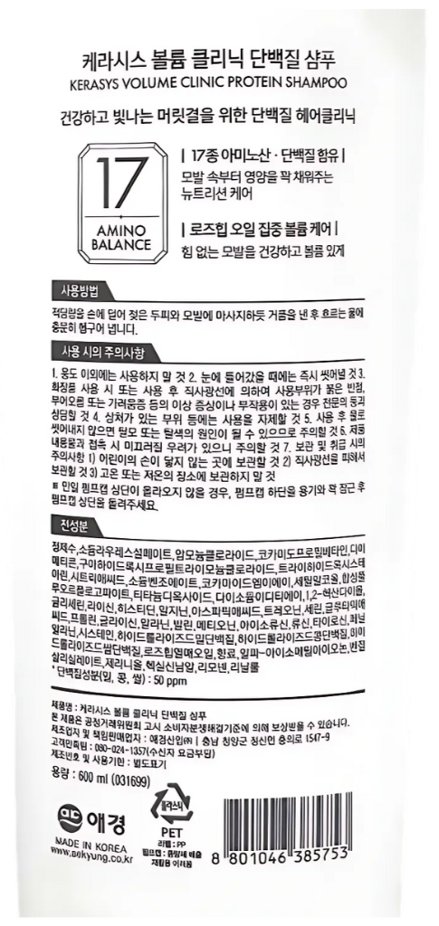 How to Use: Apply to damp hair after shampooing, focusing on mid-lengths and ends. Leave for a few minutes, then rinse. For best results, use with Kerasys Volume Clinic Shampoo.