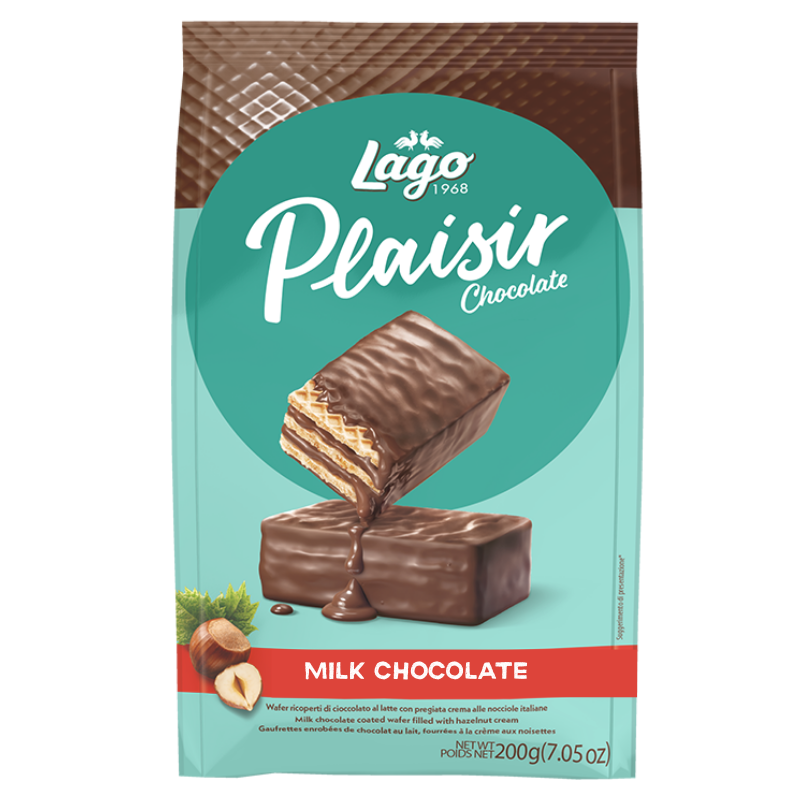 [LAGO] Plaisir Milk Chocolate Wafer – 200g features crispy wafer layers filled with smooth hazelnut cream, fully coated in rich milk chocolate. The perfect balance of crunchy texture and creamy sweetness makes this wafer an indulgent snack for chocolate lovers. Ideal for sharing, gifting, or enjoying with coffee and tea.