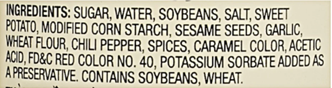 Ingredients: Sugar, water, soybeans, salt, sweet potato, modified corn starch, sesame seeds, garlic, wheat flour, chili pepper, spices, caramel color, acetic acid, FD&C red color no. 40, and potassium sorbate added as a preservative.