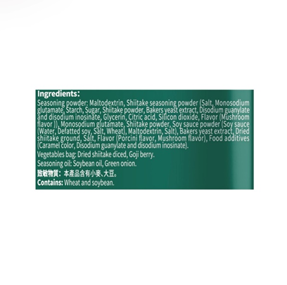 Seasoning powder: maltodextrin, mushroom seasoning powder (salt, flavour enhancer (E621, E635, E640), corn starch, sugar, shiitake powder, humectant E422, acidity regulator E33, anti-caking agent E551, mushroom flavouring), flavour enhancer (E621, E635), shiitake powder, soy sauce powder (soy sauce, wheat, maltodextrin, salt), yeast extract, ground dried shiitake mushroom, salt, flavouring (porcini flavouring, mushroom flavouring), colour E150 vegetable bags: diced dried shiitake mushroom. Seasoning oil: soybean oil, spring onion. Cereals that containing gluten. May contains eggs, milk, crustaceans, sesame, nuts and sulphur dioxide.