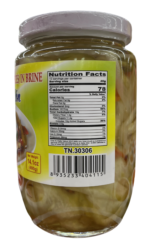 Swan Brand Picked Vegetable in Brine is a carefully selected mix of vegetables preserved in a tangy brine solution. These vegetables maintain a crisp texture and vibrant flavor, making them an excellent addition to salads, rice dishes, or as a side accompaniment. The brine enhances the natural taste of the vegetables, offering a refreshing and savory taste that pairs well with a variety of meals.
