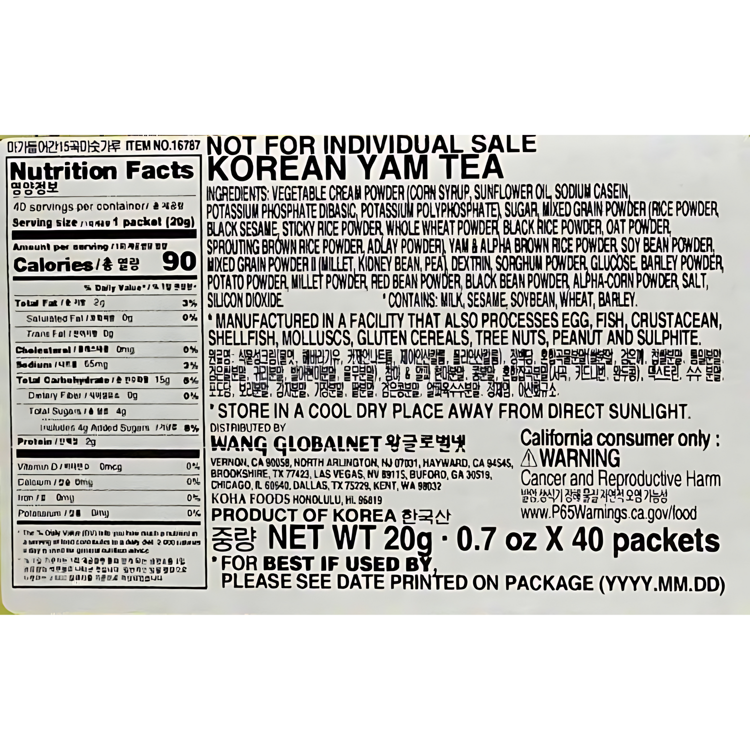 Wang Korea Yam & 15 Grain Tea is a premium instant grain drink made from yam and a blend of 15 roasted whole grains. Rich in fiber and essential nutrients, it supports digestion, provides lasting energy, and helps keep you full longer. Naturally caffeine-free, it's perfect for any time of day.